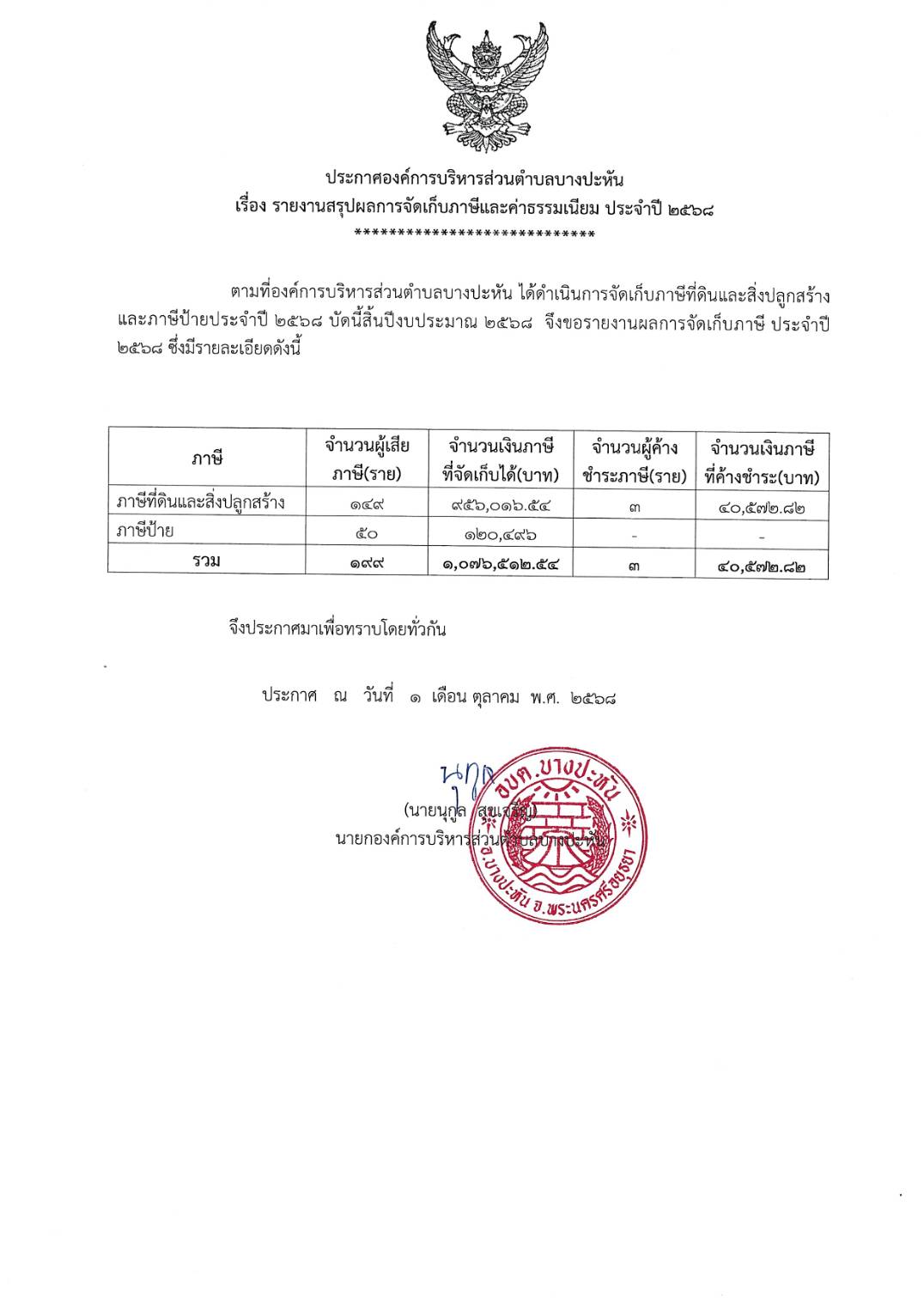ประกาศองค์การบริหารส่วนตำบลบางปะหัน เรื่อง รายงานสรุปผลการจัดเก็บภาษีประจำปี 2568