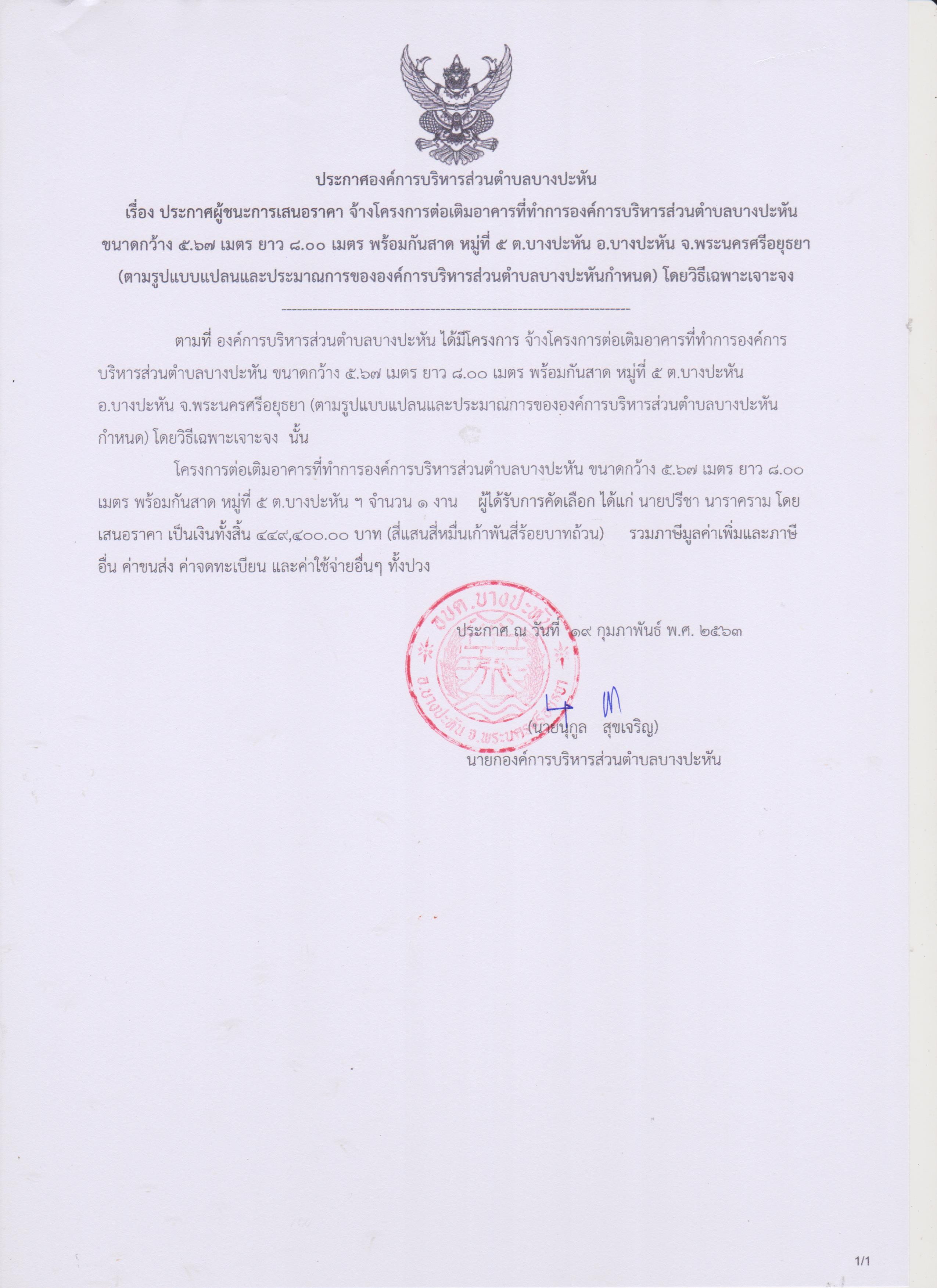 ประกาศตรวจรับงานจ้าง โครงการต่อเติมอาคารที่ทำการองค์การบริหารส่วนตำบลบางปะหัน หมู่ที่ 5 ต.บางปะหัน ฯ